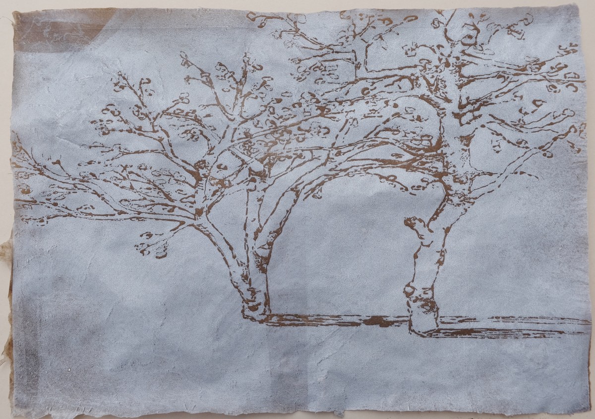Im Garten-Flachs Im Garten – IX Druckgrafik, 2019, E.A. Reservage, Druckplatte 40 x 30 cm, Hochdruck handgeschöpftes Papier aus Flachs und Baumwolle 30 x 21 cm