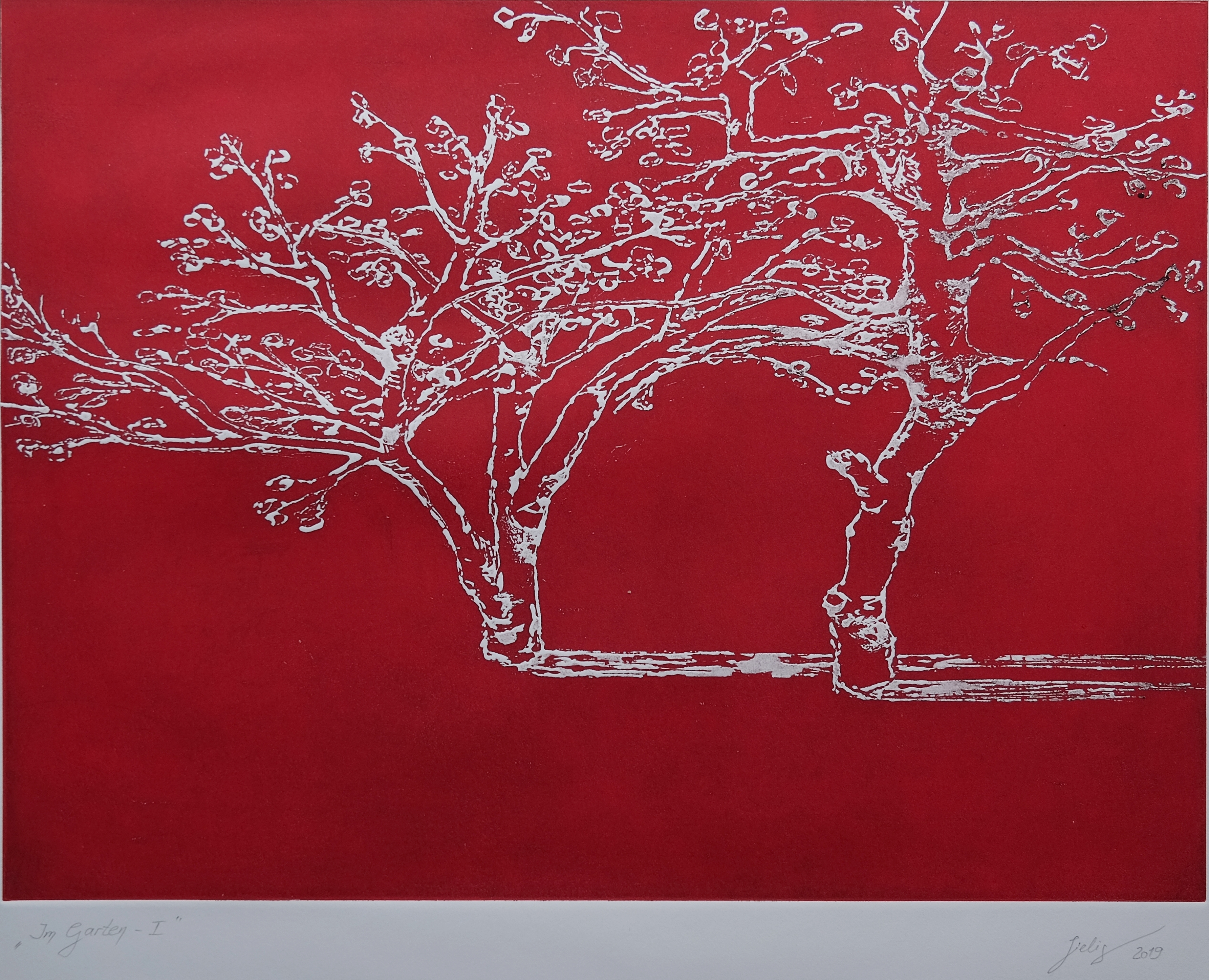 Im Garten-I Im Garten – I Druckgrafik, 2019, E.A. Reservage, Druckplatte 40 x 30 cm, Hochdruck 210g Zerkall Druckpapier 65 x 50 cm 300,-Euro
