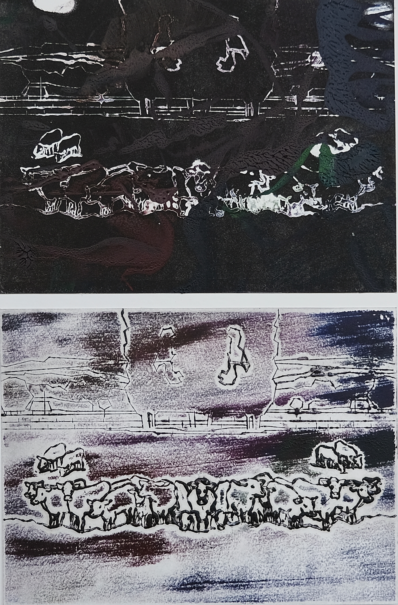 Kühe-IV Kühe-IV 8/2016, E.A. Radierung, Tiefdruck, Dècalcomanie, Druckbereich 20 x 15 cm, Büttenpapier 350 g, 40 x 30 cm, Druckgrafik 400,- €, gerahmt 450,- €