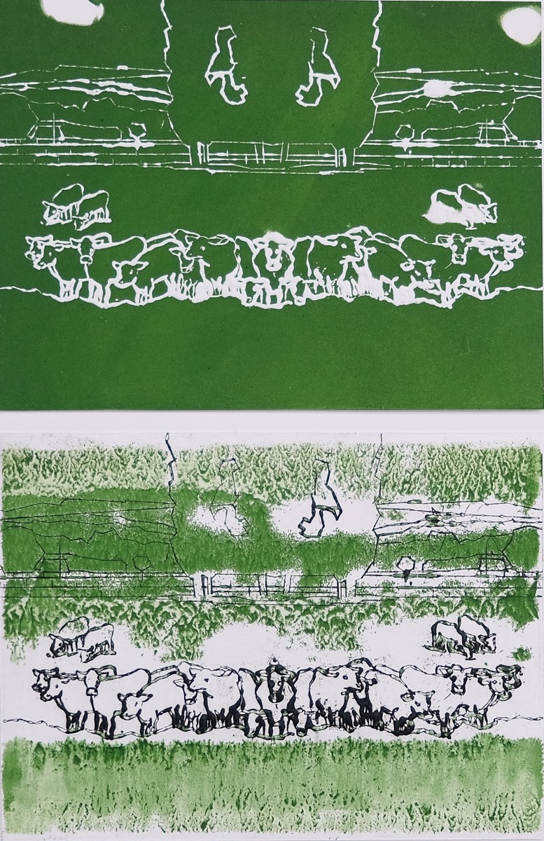 Kühe-V Kühe-V 8/2016, E.A. Radierung, Tiefdruck, Dècalcomanie, Druckbereich 20 x 15 cm, Büttenpapier 350 g, 40 x 30 cm, Druckgrafik 400,- €, gerahmt 450,- €