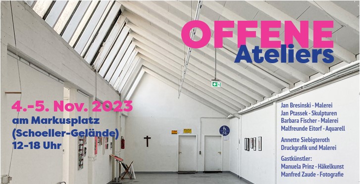 ATELIER SIEBIGTERTOTH "art&work" und Künstler*innen am Markusplatz (Schoeller-Gelände) Spinner Weg 51-54, Eitorf laden herzlich zu ihren Offenen Ateliers ein: am Samstag, 4.11.2023 von 12.00 bis 18.00 Uhr am Sonntag, 5.11.2023 von 12.00 bis 18.00 Uhr Schoeller-Gelände, Eitorf, Spinnerweg 51-54 Annette Siebigteroth - Malerei/Grafik Jan Ptassek - Skulpturen Jan Bresinski - Malerei Barbara Fischer - Malerei, Atelier Barasie Malfreunde Eitorf - Aquarell Gastkünstler: Manuela Prinz - Häkelkunst Manfred Zaude - Fotografie
