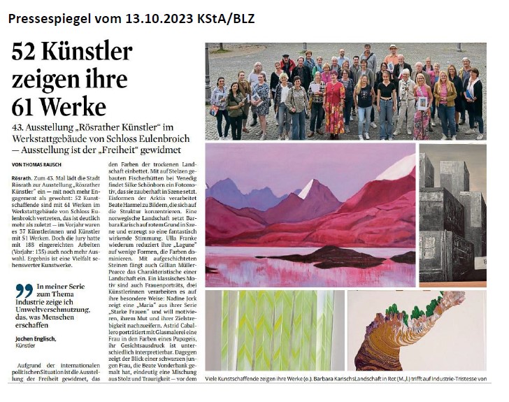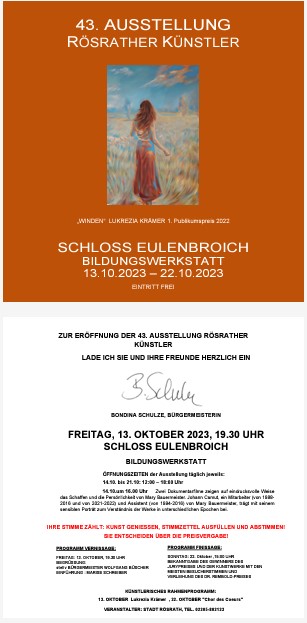 Teilnahme an der 43. Ausstellung Rösrather-Künstler Schloss Eulenbroich, Zum Eulenbroicher Auel 19, 51503 Rösrath Vernissage: 13. Oktober 2023, 19:30 Uhr Ausstellung ist geöffnet vom 14. bis 21. Oktober 2023, 12:00 bis 18:00 Uhr Finissage: 22. Oktober 2023, 15:00 Uhr Preisverleihung